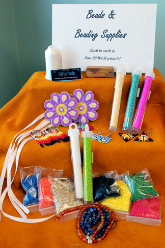 We now have an extensive line of 10/0 seed beads (some other miscellaneous beads, too) and beading supplies in stock, including beading thread, needles, findings, deer and moose hide, and more. If we don’t have what you are looking for, we can also special order!