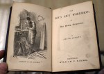 Abbott, Jacob. Boy’s Own Workshop or, The Young Carpenter. Edinburgh: William P. Nimmo, n.d., c. 1865. [5], 6-216 in navy cloth over bevelled boards with gilt- and blind-stamped title and decorations to rear (blind-stamped only), front and spine, a.e.g., charcoal eps. Small 16mo. Cover edges show heavy wear with boards exposed at corner tips, panels rubbed and somewhat soiled. Gift inscription dated Christmas 1867 inked in a beautiful hand to centre verso ffep, some transfer from frontis. to title, pages generally lightly aged with a few foxed spots on a handful of pages. An interesting text for boys written in a narrative style. Trades, Young Adult ECB10039 $45.00