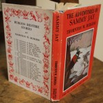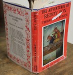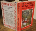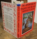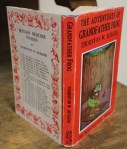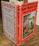 So, here I have a set of eighteen of the twenty titles in the Bedtime Story-Book series (Burgess wrote 172 books for children, mostly about animal characters and their habits and habitat). This is a Canadian edition with uniform publication dates of 1943, and all are in dust jackets – an uncommon survival for children’s books of this period. All of the DJs are in VG+ to good condition only, some with lots of chipping, edge-wear, short tears and rubs present (see photos; jackets now in archival mylar to preserve them from further damage). All of the books suffer rubbed cover head and tail edges, but the interiors are clean (one has an inscription, two have the previous owner’s name neatly inked to the top of the ffep). The first signature in each of The Adventures of Danny Meadow Mouse, and The Adventures of Grandfather Frog are intact but seem a wee bit loose, so need to be handled with care. Overall condition of the set is VG+ to VG- in VG+ to G DJs.