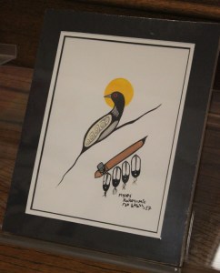 Myles Kakegamic, Untitled Loon with Feathered Pipe. Acrylic on art paper, matted in acid free materials and ready to frame (8″x 10″): SOLD