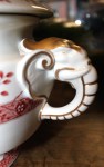 This tureen is almost perfectly preserved (there are two very light scratches from a ladle on the bottom inside of the bowl) so it looks just as it would have on the shelf of the china shop in 1890, when it was made. It is hard to believe it is over 125 years old! The elephants and those strange ducks that act as handles indicate that the design has been applied on an form carried over from the Aesthetic Movement. The transfer pattern is striking in it’s simplicity, and I think the combination adds quirkiness to this large server.